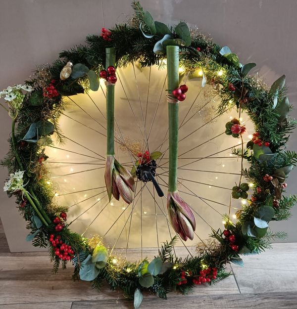 LET OP, bij het arrangement van een kerststuk op de hoge vaas dienen deelnemers zelf een eigen ( keramiek/glazen) vaas mee te nemen. van minimaal 60 cm hoogte ( Tip: bij de kringloop zijn vaak mooie hoge vazen te vinden.)