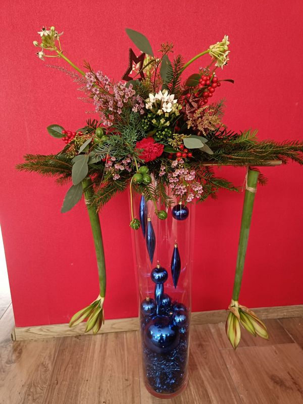 NB Bij het arrangement van een kerststuk op de hoge vaas dienen deelnemers zelf een eigen ( keramiek/glazen) vaas mee te nemen. van minimaal 60 cm hoogte ( Tip: bij de kringloop zijn vaak mooie hoge vazen te vinden.)