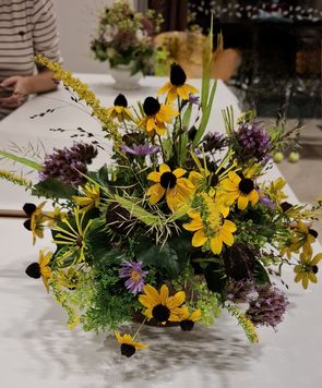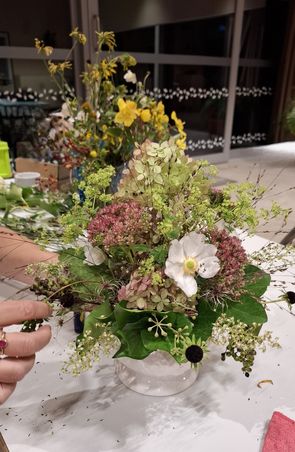Daar komen materialen naar eigen inzicht en op basis van de lesopdracht afhankelijk van je eigen creativiteit bij zoals bijv. een schaal van de kringloop en/of materialen uit eigen tuin aangevuld met aankopen bij de bloemist.