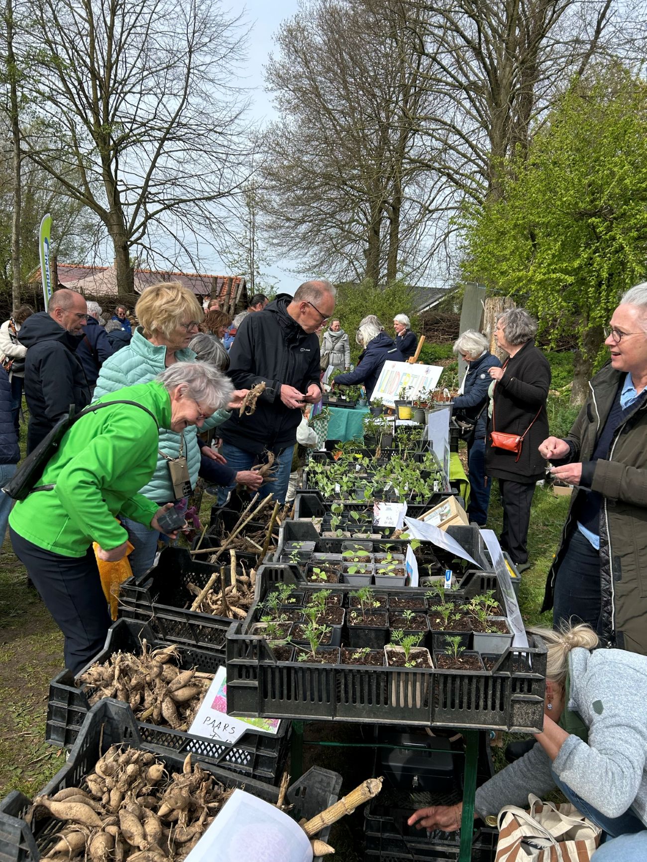Op zaterdag 11 april organiseerde Groei & Bloei Amersfoort e.o. voor de tweede keer een plantenmarkt in de Struintuin van De Groene Belevenis in Leusden. In samenwerking met De Groene Belevenis konden wij dankzij veel (hobby-)kwekers en bezoekers een mooie markt realiseren met een flink aantal kramen vol met planten, om te ruilen, maar na 11 uur ook te koop. Deze keer waren er 17 hobbykwekers, die flink hadden gezaaid, verpot, verpoot en gestekt om op de betreffende datum vanaf tien tot twee uur hun plantjes aan de man te brengen.