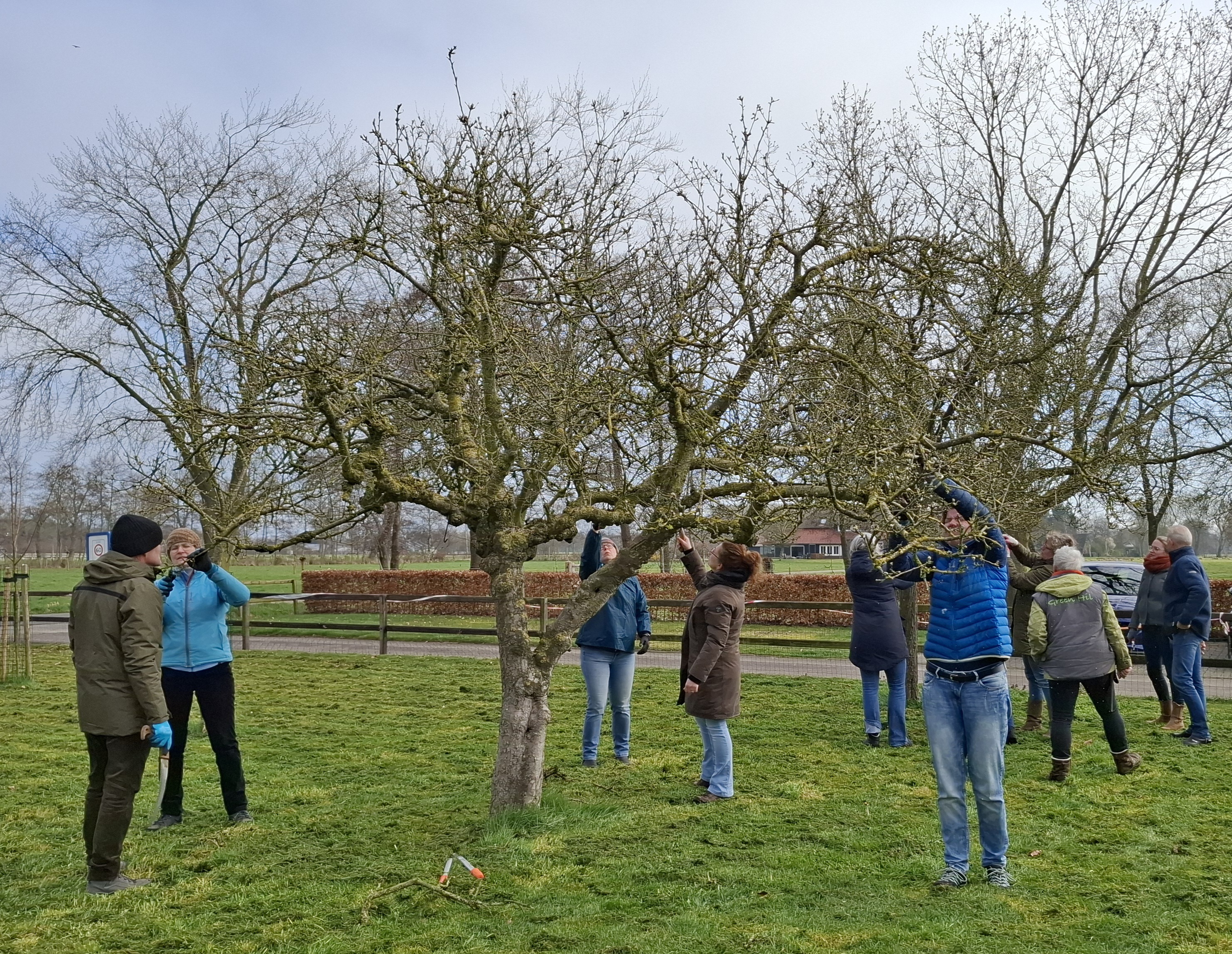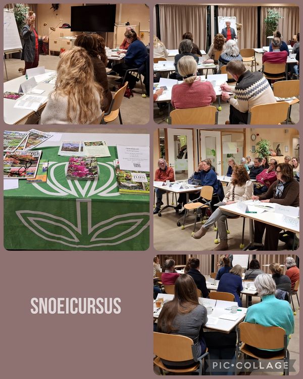 In februari en maart hebben 25 deelnemers meegedaan aan de snoeicursus die samen met Groei & Bloei Amersfoort en Nijkerk/Hoevelaken werd georganiseerd. De cursus werd gegeven door Hildegard Steenbrink van Green Hil en bestond uit 2 theorieavonden en 2 zaterdagochtenden met praktijkles. Voor de praktijkochtenden hebben twee tuineigenaars hun tuin ter beschikking gesteld. Hildegard werkte heel interactief met de groep en legde d.m.v. algemene snoeiregels heel goed uit wat je wel en niet moest doen om een plant in goede conditie te houden. Vooral de verjongingssnoei die je kunt toepassen was zeer leerzaam. Wat is de beste snoeitijd voor de verschillende bomen en struiken? Ook vaste planten, rozen, klimplanten en fruitbomen kwamen aan de orde. Kortom een enorme hoeveelheid kennis die door Hildegard werd overgebracht. De deelnemers gingen tijdens de praktijkochtend onder begeleiding van Hildegard in groepjes aan de slag. Deze samenwerking werd door zowel de tuineigenaren als de deelnemers heel positief ervaren. Men gaf ook aan ervan te hebben genoten om met elkaar kennis te delen en in de tuin aan de slag te gaan.